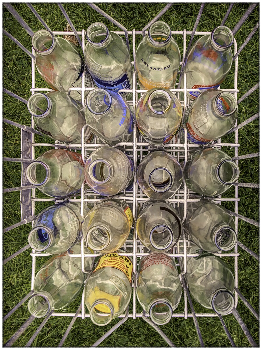 I was attracted by the abstract quality in the pattern and colour of these empty milk bottles in a wire crate.