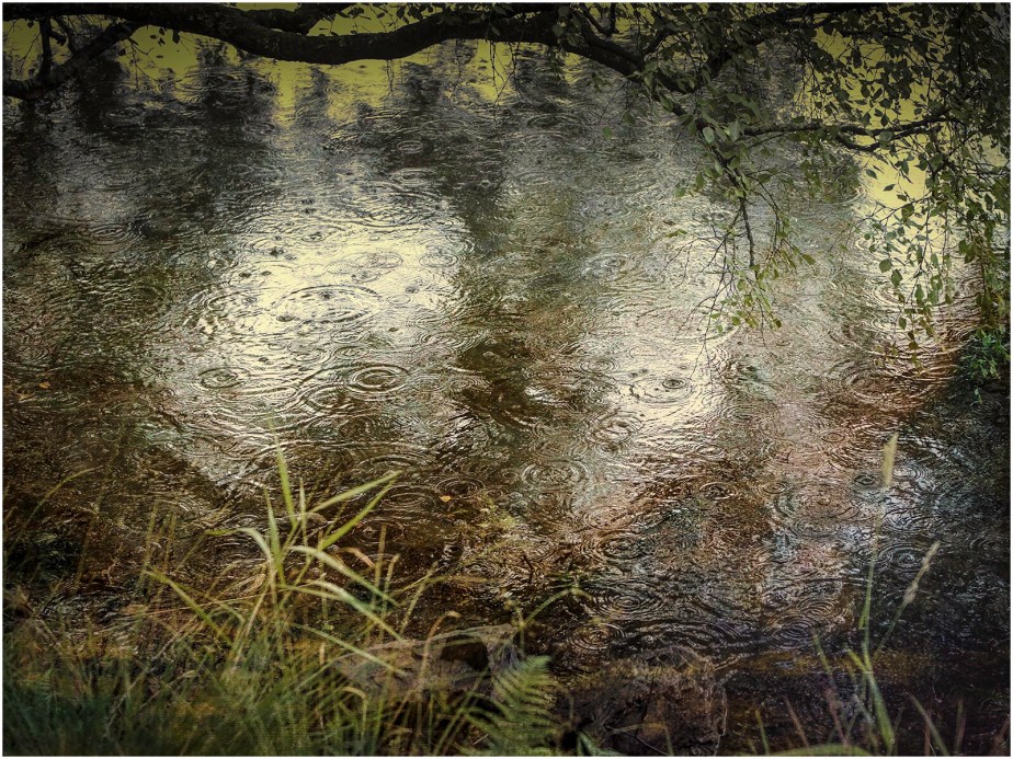 Rain drops falling on Tarn Hows in the Lake District.