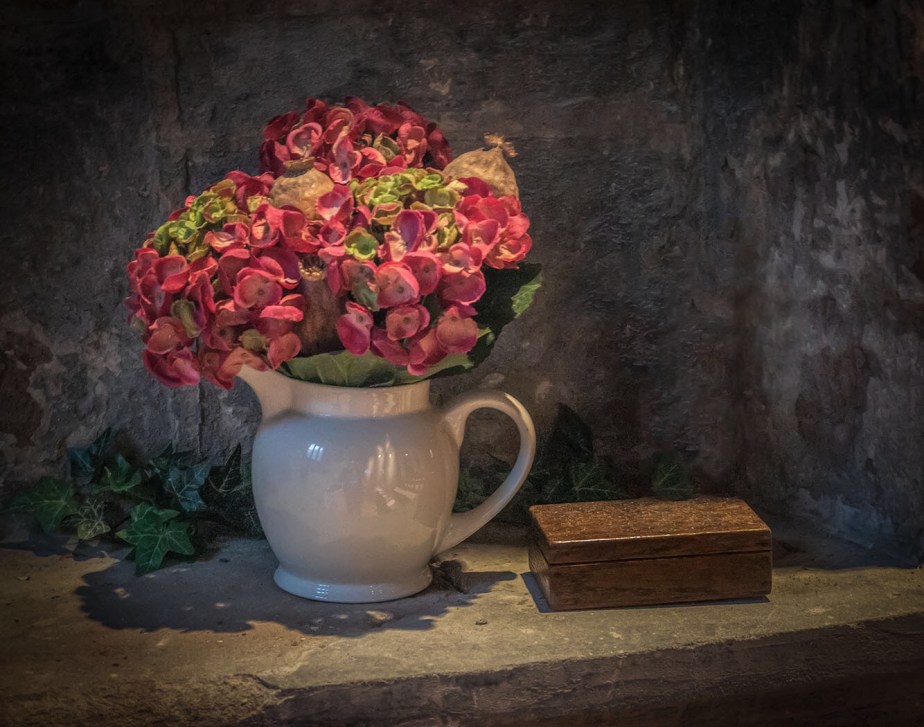 Jug of flowers with box on a stone ledge in the 13th Century Church of St John the Baptist, Brinklow, Warwickshire.
