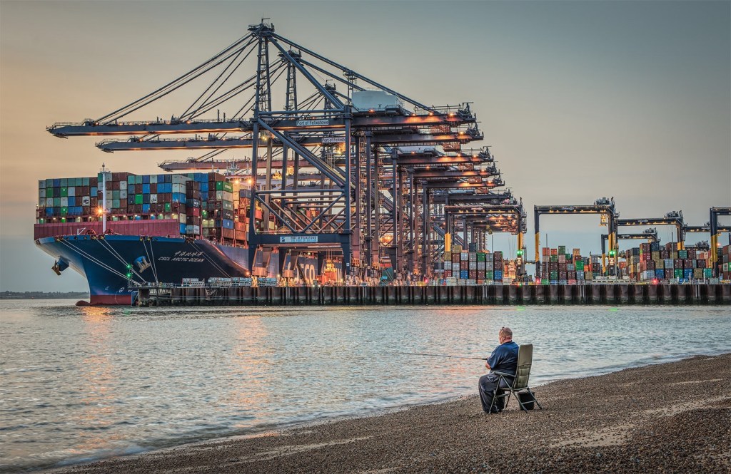 I was drawn to this early evening scene in the Port of Felixstowe, UK, because the stance and activity of the fisherman somewhat resemble those of the cranes in the background and liked the idea that this might be how a dock worker spends his leisure time.